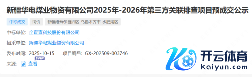近日九游体育app娱乐,企查查科技股份有限公司中标新疆华电煤业物质有限公司2025年-2026年第三方计划排查神色,招采单元为新疆华电煤业物质有限公司,采购形势为公开询比采购。据悉,新疆华电煤业物质有限公司为中国华电集团有限公司全资孙公司。