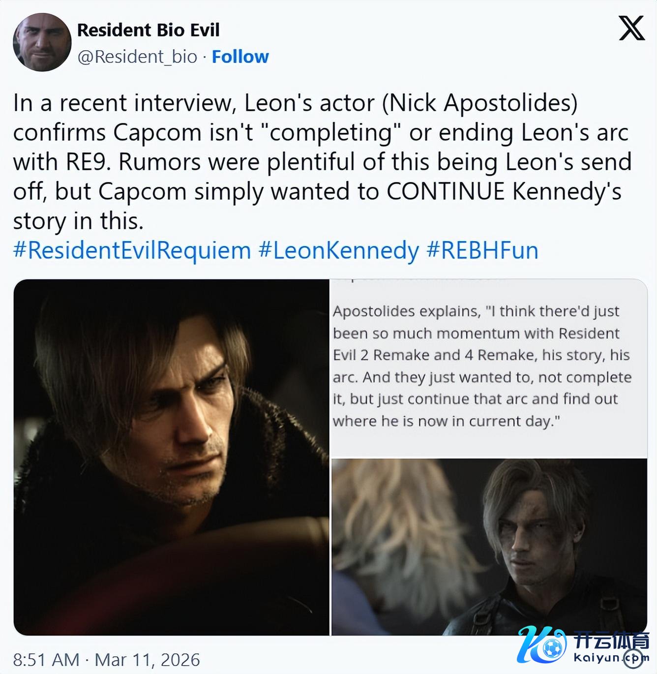 《生化危急9》里昂的演出者尼克·阿波斯托利德斯最近袭取媒体采访,线路生化9并非里昂的终末一部作品九游体育app娱乐,这与游戏发售前全国的巨额主意天壤悬隔。